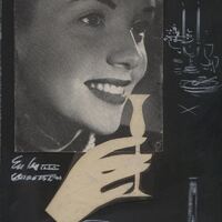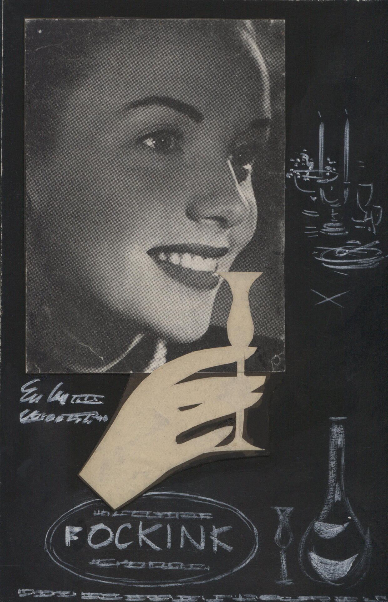 - Cartel compuesto con distintos materiales, sobre papel con fondo oscuro una fotografía de una mujer de perfil sonriendo, debajo de ella a la altura de su boca la figura de una mano sujetando una copa en blanco, y en el resto del cartel bocetos en blanco de una botella junto a una copa y la silueta de unas velas y demás objetos.