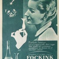- Cartel con la imagen fotográfica de la cabeza de una mujer junto al dibujo en blanco de una mano que sujeta una copa a la altura de su boca, junto a ella la silueta en blanco de un grupo de personas bailando en una fiesta, debajo de la composición, el rótulo correspondiente al anuncio del licor.