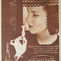- Cartel con la imagen fotográfica de la cabeza con tocado de una mujer junto al dibujo en blanco de una mano que sujeta una copa a la altura de su boca, debajo de la composición, el rótulo correspondiente al anuncio del licor.