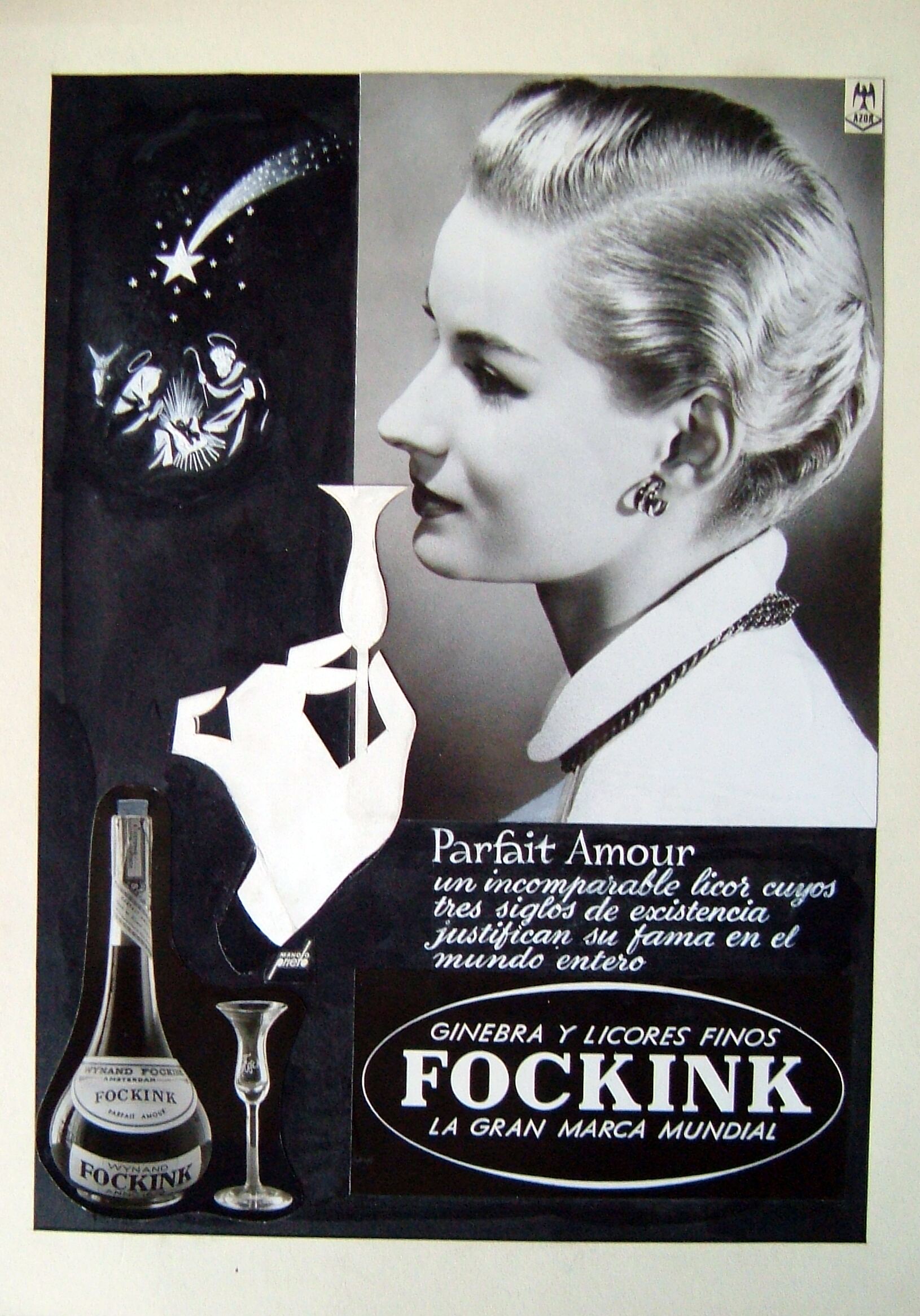 - Cartel con la imagen fotográfica de la cabeza de una mujer junto al dibujo en blanco de una mano que sujeta una copa a la altura de su boca, junto a ella la silueta en blanco de de la Sagrada Familia en la Noche de Navidad, el rótulo correspondiente al anuncio del licor.