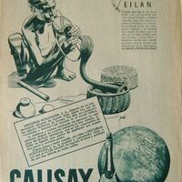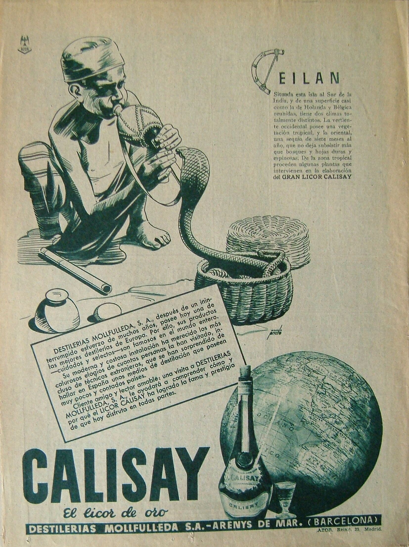 - Cartel con la imagen de un hombre indio con un turbante en su cabeza tocando un instrumento cuya música hace salir de su cesta a una serpiente, debajo la imagen de un globo terráqueo junto a un a botella de Calisey.