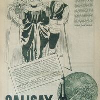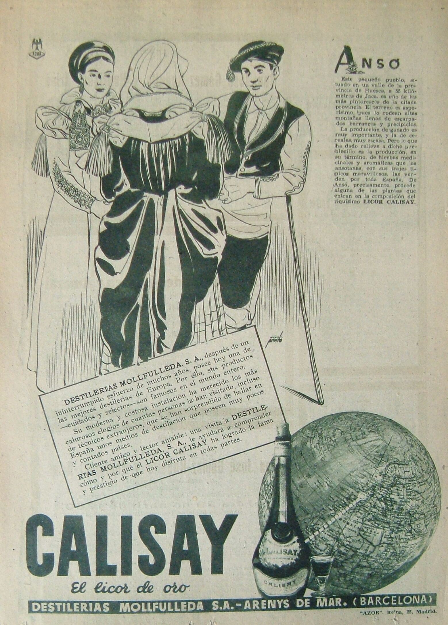 - Cartel con la imagen de tres personajes hablando entre sí vestidos con los trajes típicos de Ansó pequeño pueblo de Huesca de donde se extraen elementos naturales para fabricar el licor, debajo la imagen de un globo terráqueo junto a un a botella de Calisey.