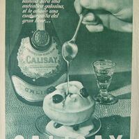 - Cartel con la imagen fotográfica de una mano que con una cuchara vierte sobre una copa de helado licor Calisay dándole el toque final, debajo las letras del licor en grande y en blanco.