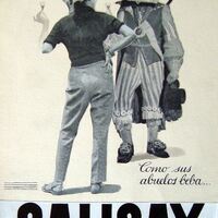 - Imagen fotográfica de una mujer actual con pantalones de espaldas al espectador que mientras sujeta una copa en su mano observa la figura de un caballero de tiempos pasados, junto a las figuras las letras donde se puede leer “como sus abuelos beba… Calisay”.