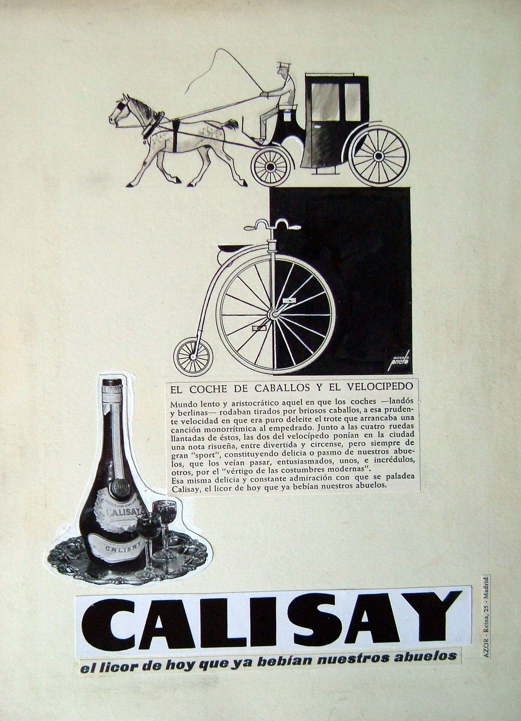 - Cartel de Calisay, en primer lugar en la parte superior del cartel el dibujo de un caballo tirando de un carruaje conducido por un cochero, debajo la imagen de una botella del licor anunciado junto al boceto de la leyenda y el rótulo del cartel.