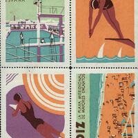 - Tira de cuatro sellos de la provincia de Cádiz, con una primera imagen de una piscina olímpica, a su lado una bañista tirándose desde un trampolín, debajo una mujer contraje de baño oscuro tumbado bajo una sombrilla leyendo un libro, por último el dibujo de una de las maravillosas playas gaditanas.