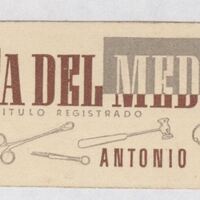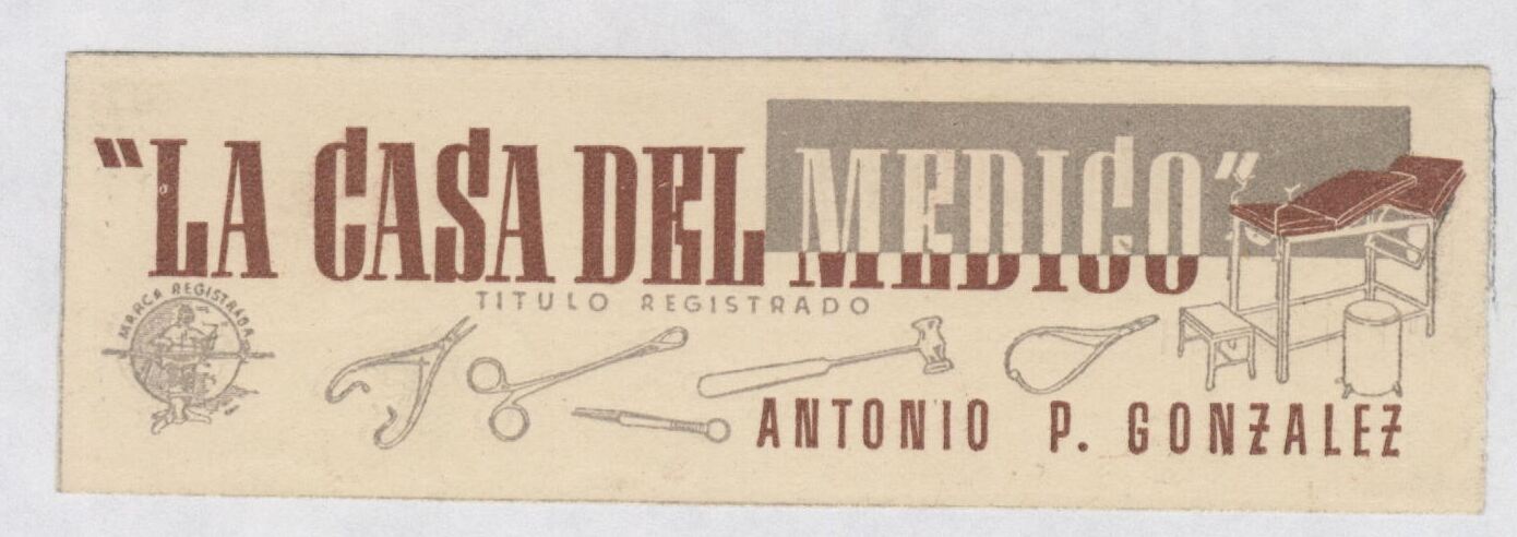 - Con letras rojas y blancas el rótulo”La casa del médico”, rodeado de objetos e instrumental médico.