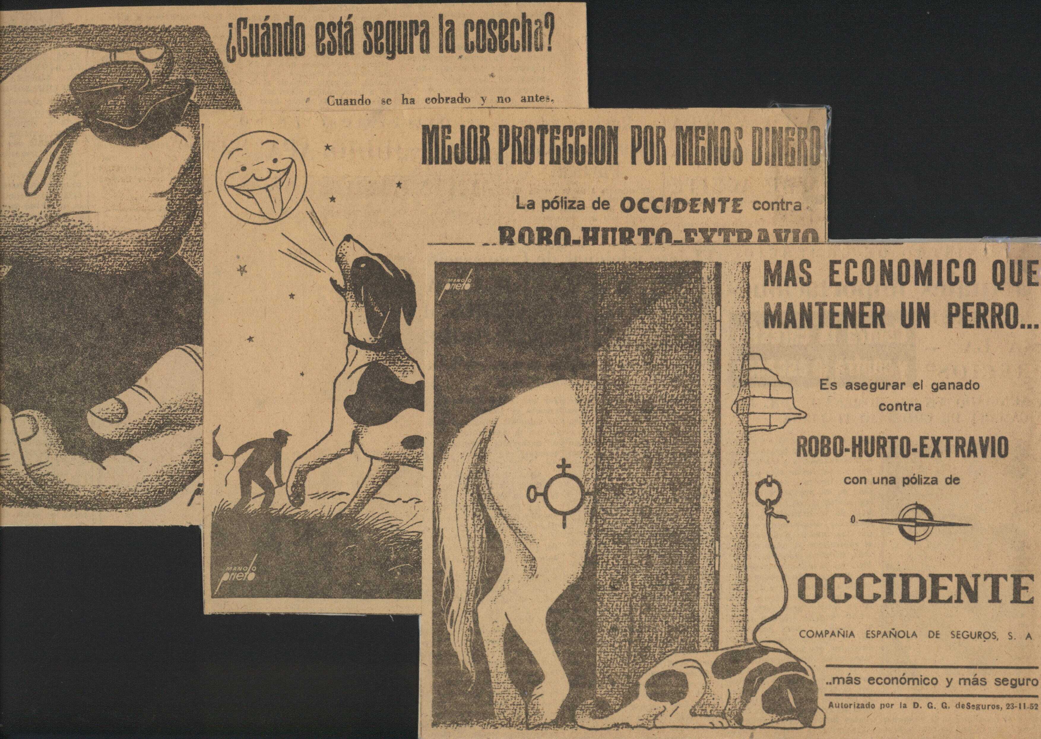 - Imagen que muestra una superposición de tres anuncios publicados en prensa, con diferentes escenas correspondiente a una marca de seguros, y en las que ha intervenido Manolo Prieto.