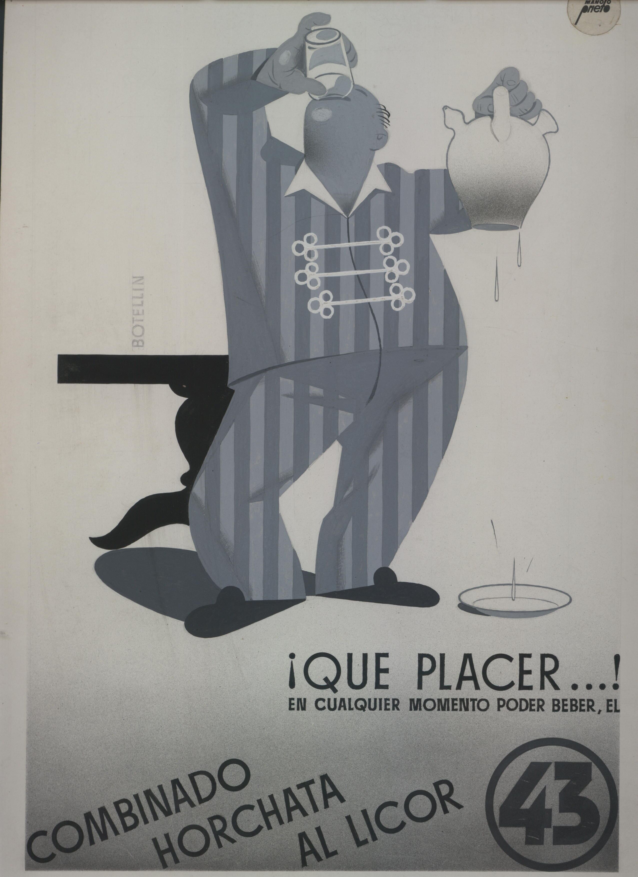- Cartel publicitario de Licor 43 en tonos grises con dos toques de negro en la silueta de la mesa y las zapatillas que lleva el señor, aparece en la escena la figura de un señor en pijama sujetando en una de sus manos un botijo y en la otra un vaso de donde bebe, debajo la leyenda correspondiente al anuncio.
