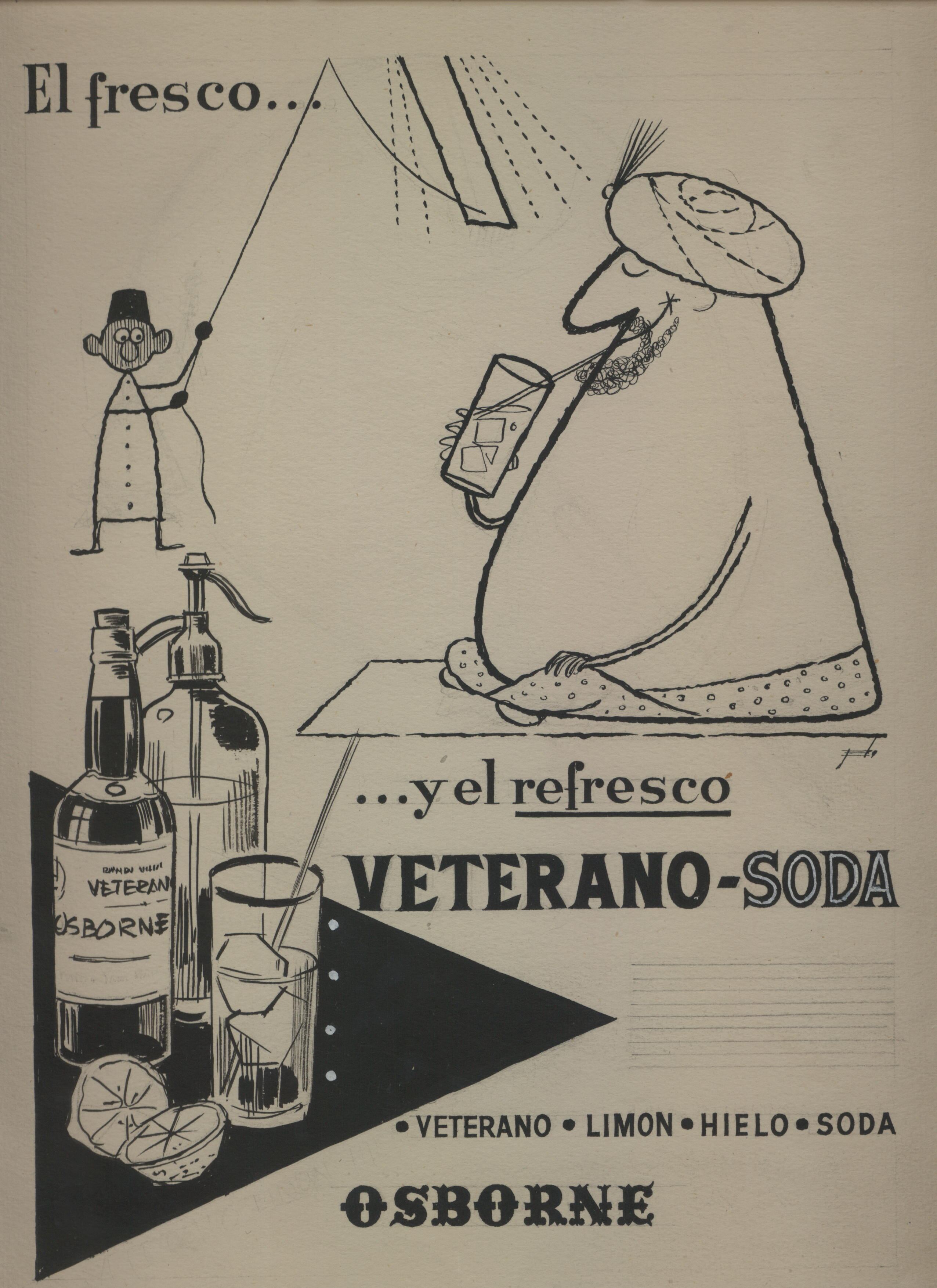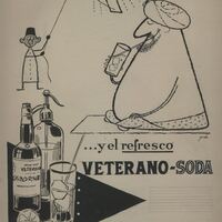 - Cartel donde en un primer plano aparece la esquina en negro de una mesa, con una botella de veterano otra de soda, un limón cortado y un vaso con hielo, detrás la imagen de un muñeco caracterizado que representa a un hombre árabe con turbante sentado sobre una alfombra bebiendo el refresco mientras que un mono le abanica.