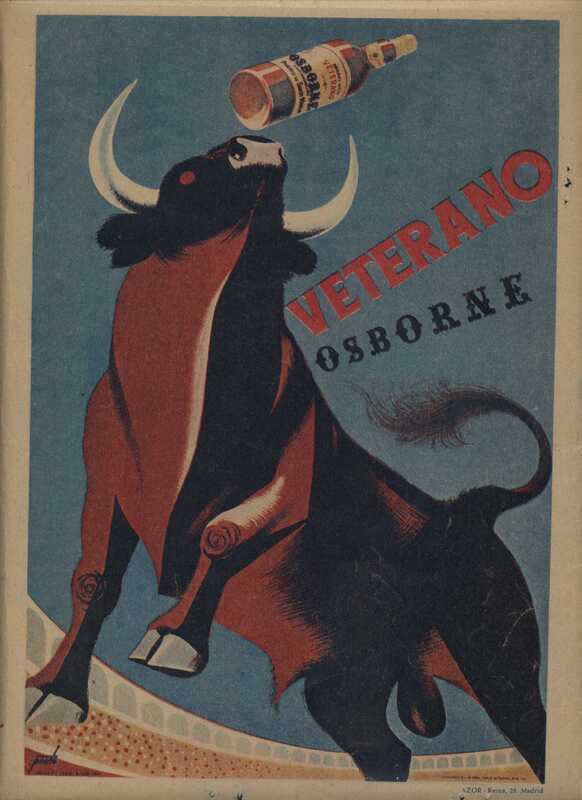 Sobre un fondo azul ocupando la parte inferior del cartel el semicírculo de las gradas del ruedo, se representa un toro saltando para alcanzar con el morro una botella de Veterano Osborne. No es una obra original del artista, desde el punto de vista material, sino el recorte publicitario de un anuncio aparecido en la presa.