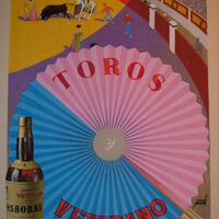 Cartel donde ocupando parte esencial de la escena la imagen de una sombrilla de papel mitad rosa mitad azul, con letras en rojo donde se lee toros y Veterano, como fondo el ruedo con el toro, el torero y su cuadrilla, y en un primer término situado en la esquina inferior izquierda una botella de Veterano Osborne. No es una obra original del artista, desde el punto de vista material, sino el recorte publicitario de un anuncio aparecido en la presa.