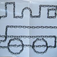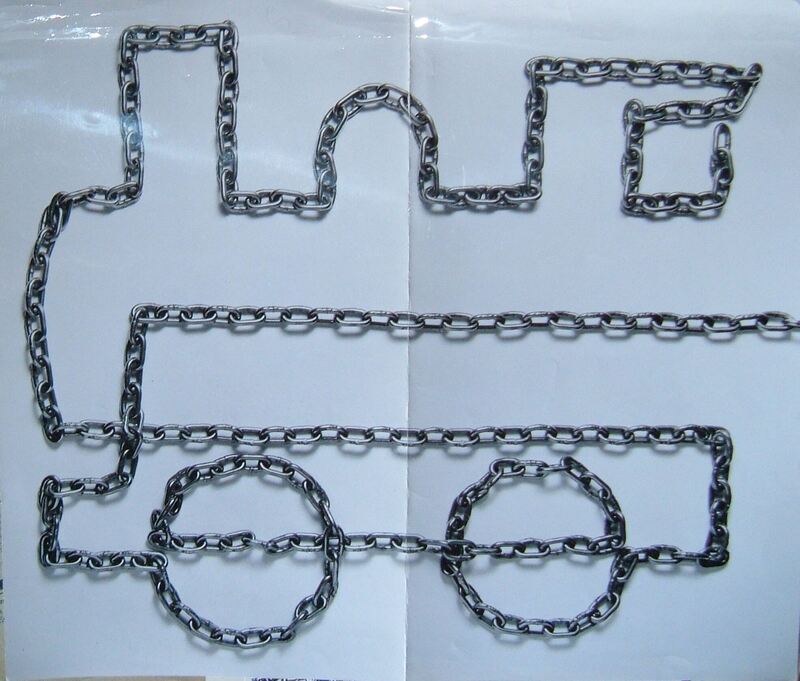- Fotografía que muestra, sobre un fondo blanco, el extraordinario dibujo realizado con una sola cadena que forma la imagen de una antigua locomotora.