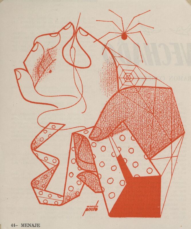 - Impresión sobre papel, en color rojo, de dos grandes manos, una de ellas sujetando una corbata de lunares y en la otra una aguja hilvanada. En la parte izquierda de la escena una tela de araña rematada por la figura de una araña.