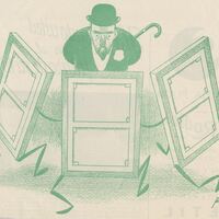 - En primer término la trasera de tres cuadros caracterizados, con patas frente a un hombre con bombín y bastón, parece que casi bailando, y que observa la escena con atención.