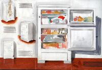 Neveras Primer boceto del futuro cartel publicitario de una marca de nevera, con la imagen de un conjunto de neveras cerradas, abiertas, de diferentes tamaños y en diferentes posiciones sobre un suelo rojo de baldosas.