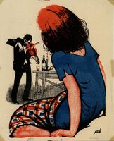 Nietotchka Nezvanova. Una mujer de espalda con el pelo rojizo, una camiseta azul y una falda con dibujos parece observar como un hombre, que aparece en segundo plano, toca el violín. Al lado del hombre hay una botella, un vaso y un candelabro con una vela encendida. El dibujo está firmado.Prueba de imprenta. Ilustración realizada para la revista semanal Novelas y Cuentos. Titulo: Nietotchka Nezvanova; Autor: Hedor Dostoiesky; Nº publicado: 996; Fecha: 11-06-50; Tomo NC. 39.