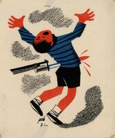 MUY RESERVADO. Un niño con pantalón corto de color negro y una camiseta azul a rayas negras se retuerce y abre la boca de dolor al clavársele una bayoneta, objeto punzante que le atraviesa por la espalda. El dibujo está firmado.Prueba de imprenta. Ilustración realizada para la revista semanal Novelas y Cuentos. Titulo: Muy reservado. Autor: Nevil Shute. Nº publicado: 1135. Fecha: 05-02-1953. Tomo NC. 44.