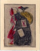 OLIESIA Parece que este dibujo enmarcado trata de mostrar una figura humana aunque no muy bien definida. Sus ropajes son de color negro y rojo. Sobre su espalda porta una bolsa amarilla y sobre ella, posado, un cuervo negro.Boceto realizado para la ilustración de la revista Novelas y Cuentos. Titulo: Oliesia. Autor: Alejandro Kuprin. Nº publc.: 1031. Fecha: 11-02-1951. Tomo NC. 49 PI/.514