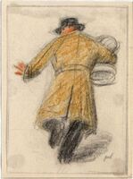 NUEVOS TRIUNFOS DE SHELOCK HOLMES. En este dibujo enmarcado y donde el autor ha realizado el boceto de su firma un hombre de espalda corre escapando de algo dejándose adivinar por el giro de su cabeza que mira hacia atrás. Su traje se compone de un pantalón negro, al igual que su sombrero y una gabardina amarilla. Bajo el brazo lleva un objeto blanco.Boceto realizado para la ilustración de la revista semanal Novelas y Cuentos. Titulo: Nuevos Triunfos de Shelock Holmes. Autor: A. Conan Doyle. Nº publicado: 1257. Fecha: 12-06-1955. Tomo NC. 33