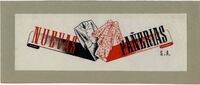 Nuevas Pañerías Cartel publicitario de Nuevas Pañerías, cuyas letras aparecen en rojo y negro en cuyo espacio central entre los dos rótulos aparece la imagen de un traje de chaqueta de un hombre y un vestido de mujer en rojo.