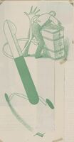 Objeto dirigiendo a un hombre con maleta Dibujo a lápiz verde, donde en primer término se aprecia un objeto alargado con mango caracterizado con manos que dirigen a un hombre que se encuentra en segundo plano portando o depositando una maleta.