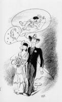Novios recién casados Imagen de a una pareja de novios, el novio con chaqué y sombrero de baquero, de cada uno de ellos sale un bocadillo con la representación de sus pensamientos, el novio piensa que su mujer es su heroína representado con el dibujo de una mujer valiente abalanzándose sobre un gran oso, sin miedo a nada, y la mujer encantada por el hechizo del amor.
