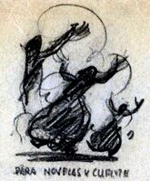 Para novelas y cuentos 2 En un boceto ha dibujado el pintor la imagen de un hombre sentado con traje y sombrero mejicano. Se ve, también, la imagen de otro hombre al que solamente se le ve el sombrero. Predomina el color blanco y gris. Líneas torcidas y abocetadas intentan enmarcar el dibujo.