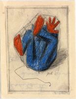 PESADILLA. En el dibujo enmarcado se destaca la figura de un hombre con un traje azul atrapado en una red de la que pretende liberarse ayudándose de sus manos y pies descalzos. Acompaña a la imagen el boceto de la firma del pintor.Boceto realizado para la ilustración de la revista semanal Novelas y Cuentos. Titulo: Pesadilla. Autor: Edward S. Aarons. Nº publicado: 1120. Fecha: 26-10-1952 Tomo NC. 36.