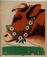 Perfil de una vaca con corona de flores En este dibujo firmado, en el que el color verde está presente por los pastos que se vislumbran en el fondo de la composición, se ha representado la cabeza de perfil de una vaca marrón a la que se ha adornado con una corona de flores blancas y hojas verdes.Prueba de imprenta. Ilustración realizada para la revista semanal de Novelas y Cuentos. Titulo: Autor: Nº publicado: Fecha: Tomo NC.