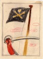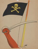 piraterías del famoso capitán singleton. En lo alto de un mástil de un barco ondea la bandera pirata con el dibujo de la calavera y los dos huesos cruzados sobre un fondo negro. De la parte inferior del barco surge el brazo de un pirata que lo levanta empuñando una espada, colocada horizontalmente. En el fondo del dibujo enmarcado se aprecian unas manchas de color rojo que dan la impresión de nubes.Boceto realizado para la ilustración de la revista semanal Novelas y Cuentos. Titulo: Piraterias del famoso capitán Singleton. Autor: Daniel Defoe. Nº publicado: 944. Fecha: 12-06-1949. Tomo NC. 20.