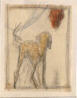 Perro Dibujo a lápiz, de un perro apoyado sobres sus patas delanteras y en el aire las traseras, momento que capta el salto del perro, que ocupa todo la escena, realizado con una técnica muy libre.
