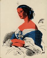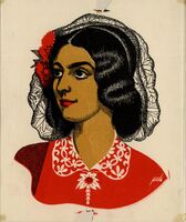 Retrato de mujer desconocida Una mujer con una mantilla sobre su pelo negro, en el que hay también una flor roja, sonríe en este retrato firmado. Su rostro mira hacia el lado derecho y destaca su vestido rojo con la gola blanca. Su piel es muy morena, sus labios son rojos y sus ojos negros son vivaces.Prueba de imprenta. Ilustración realizada para la revista semanal de Novelas y Cuentos. Titulo: Autor: Nº publicado: Fecha: Tomo NC.