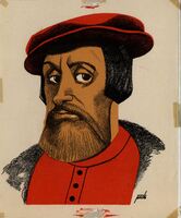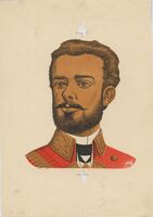 Retrato de personaje desconocido En el centro de este dibujo se ha realizado el retrato de un personaje con la mirada muy directa y con el semblante serio. Lleva una chaqueta roja con adornos dorados y sobre ella se puede vislumbrar la firma del pintor en color blanco. En su rostro le crece una barba castaña, del mismo color que su pelo.Prueba de imprenta. Ilustración realizada para la revista semanal de Novelas y Cuentos. Titulo: Autor: Nº publicado: Fecha: Tomo NC.