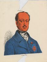 Retrato de personaje desconocido Se ha realizado en este retrato firmado el busto de un hombre con el traje azul, sobre el que se ve el detalle de un escudo rojo, y con camisa blanca. En su rostro destaca un fino bigote. La figura mira hacia el frente.Prueba de imprenta. Ilustración realizada para la revisgta semanal de Novelas y Cuentos. Titulo: Autor: Nº publicado: Fecha: Tomo NC.