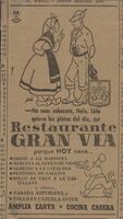 Restaurante Gran Vía 2 Anuncio publicitario correspondiente a la carta de un restaurante de la Gran Vía de Madrid, donde se lee los diferentes platos del día junto al dibujo de las figuras de un hombre y una mujer vestidos con traje regional.