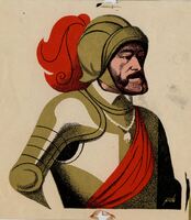 Retrato de personaje desconocido Sobre un fondo en el que destacan matorrales grisáceos se ha realizado el retrato de un hombre de frente y de cintura para arriba llevando una armadura azul. sus manos están sobre la cintura donde se encuentra su espada. La composición está firmadaPrueba de imprenta. Ilustración realizada para la revista semanal de Novelas y Cuentos. Titulo: Autor: Nº publicado: Fecha: Tomo NC.