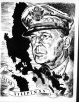 Retrato del Comandante Mcarthur En primer término el retrato del Comandante Mcarthur, quien estuvo al frente de la contienda en las Islas Filipinas durante la Segunda Guerra Mundial. El cartel tiene claros tintes épico-políticos.