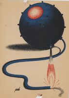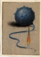 ROULETABILLE EN RUSIA Sobre un fondo claro oscuro y enmarcado el dibujo de una bomba explosiva de color azul tiene en su extremo una llama pequeña amarillenta y rojiza. La bomba parece una de las clases de bombas acuáticas.Boceto realizado para la ilustración de la revista semanal Novelas y Cuentos. Titulo: Rouletabille en Rusia. Autor: Gastón Lerouy. Nº public.: 924. Fecha: 23-01-1949. Tomo NC.: 10. PI/. 323.