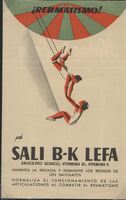 Sali B-K Lefa Cartel anunciando una marca contra el reumatismo y el mal de huesos, con la imagen de una carpa y de dos trapecista en el aire, el hombre sobre un columpio agarra a una mujer en pleno vuelo, debajo de ellos la leyenda correspondiente al spot publicitario.