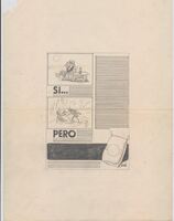 Si…Pero En el boceto de este cartel se pueden apreciar dos dibujos. En la parte superior bajo el lema de “si” se ve a un hombre plantando un árbol y por debajo se ve el dibujo de unos insectos serrando un árbol bajo el lema de “pero”. En la parte inferior destaca una franja negra, gruesa y horizontal sobre la que se ha dibujado un saco blanco. En toda la composición destacan líneas rectas horizontales, a la izquierda, entre los dos dibujos y bajo la franja negra. Predominan líneas oscuras sobre un fondo claro. Está presente la firma del pintor en la esquina de la izquierda en la parte inferior.