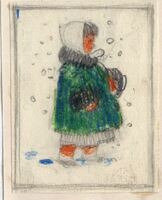 SILAS MARNER. En un paisaje de invierno frío donde todo está sepultado por la nieve destaca la figura de un niño pequeño de perfil. Muy abrigado, lleva un abrigo verde por encima de un vestido blanco y un gorro también blanco. El dibujo se halla enmarcado.Boceto realizado para la ilustración de la revista semanal Novelas y Cuentos. Titulo: Silas Marner. Autor: George Eliott. Nº publicado: 1290. Fecha: 29-01-1956 Tomo NC. 32.