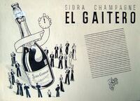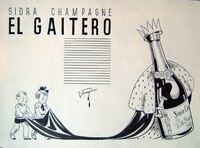 Sidra Champagne El Gaitero Anuncio de una marca de sidra, donde en la parte superior aparece el rótulo correspondiente, y debajo la imagen de una pareja de niños sujetando la cola de una capa majestuosa que envuelve la figura de una botella de sidra.