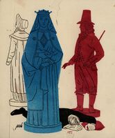 Tres estatuas y un hombre muerto Tres estatuas configuran esta imagen en la que también se vislumbra la firma del pintor. Se encuentra la estatua de una reina de color azul, la estatua de un hombre de perfil en color rojo y por último una estatua femenina de color blanco de espalda. En el suelo, detrás de la estatua azul, yace el cuerpo de un hombre muerto.Prueba de imprenta. Ilustración realizada para la revista semanal Novelas y Cuentos. Titulo: Autor: Nº publicado: Fecha: Tomo NC.: