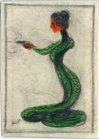 TRAGICA HERENCIA. Una mujer serpiente con el cuerpo de reptil verde enrollado en su extremidad y cabeza humana coge en sus manos una pistola que dispara. La figura se halla de perfil y enmarcada en este dibujo donde también se destaca el boceto de la firma del pintor.Boceto realizado para la ilustración de la revista semanal Novelas y Cuentos. Titilo: trágica herencia. Autor: A. du Maurier. Nº publicado: 1312. Fecha: 07-07-1956. Tomo NC.: 57.