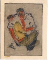 TRAS LA ALAMBRADA. Dos hombres agarrados uno contra el otro se pelean por los suelos usando las manos. Al lado de uno de ellos hay una pistola. Es un dibujo que se halla encuadrado mediante líneas gruesas de color negro.Boceto realizado para la ilustración de la revista semanal Novelas y Cuentos. Titulo: Tras la alambrada. Autor: Luke Allan. Nº publicado: 929. Fecha: 27-02-1949. Tomo NC. 20.