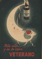 Veterano Cartel publicitario de Veterano felicitando el Nuevo Año, donde aparece una media luna sobre fondo oscuro bebiendo una copita de Veterano, debajo de los rótulos en rojo del anuncio.