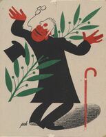 Una rama atraviesa el cuerpo de un hombre Un hombre con el traje negro es atravesado por una gran rama de hojas verdes. El sombrero vuela por el aire lo mismo que su bastón y las gafas. El hombre es calvo pero con una espesa barba blanca en su rostro.Prueba de imprenta. Ilustración realizada para la revista semanal de Novelas y Cuentos. Titulo: Autor: Nº publicado: Fecha: Tomo NC.
