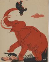 VALMIREH. En esta composición, en la que destaca la firma del pintor, se ve a un gran elefante rojo con largos colmillos, de perfil, que sostiene en su trompa a un animal negro para lanzarlo contra el suelo. En segundo plano se ve un hombre tendido en el suelo con un animal a su lado.Prueba de imprenta. Ilustración realizada para la revista semanal de Novelas y Cuentos. Titulo: Valmireh. Autor: J. H. Rosny. Nº publi8cado: 857. Fecha: 12-10-1947. Tomo NC. 23.