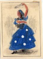Una sevillana Una sevillana con el traje azul de bolas blancas baila levantando el brazo izquierdo, cuyo extremo se halla cogiendo un abanico blanco, mientras que su brazo derecho, en una posición más baja, coge graciosamente el vestido. En este dibujo se puede apreciar sutilmente el boceto de la firma del pintor situado en el lado izquierdo inferior.Boceto Realizado para la ilustración de la revista Novelas y Cuentos. Titulo: Autor: Nº publicado: Fecha: Tomo NC. No. PI/. No